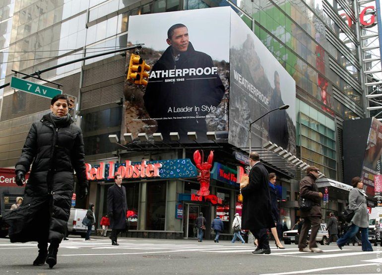 "Huh, this is our jacket!" – exclaimed The Weatherproof Garment Company and installed a billboard in Times Square on Wednesday showing President Obama wearing what appears to be one of its coats. The image, which is licensed by The Associated Press, was taken during the president’s visit to the Great Wall of China last November. Weatherproof also put the image on its Web site home page for a time on Wednesday, promoting “The Obama Jacket.”